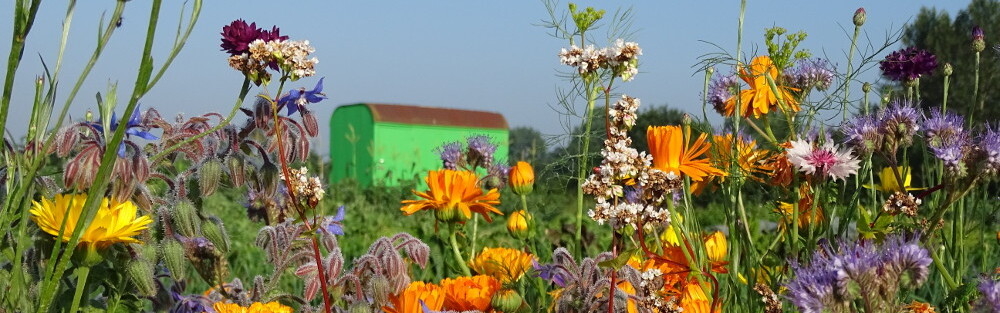 KI generiert: Bunte Wildblumen im Vordergrund, grüner Bauwagen im Hintergrund, blauer Himmel.