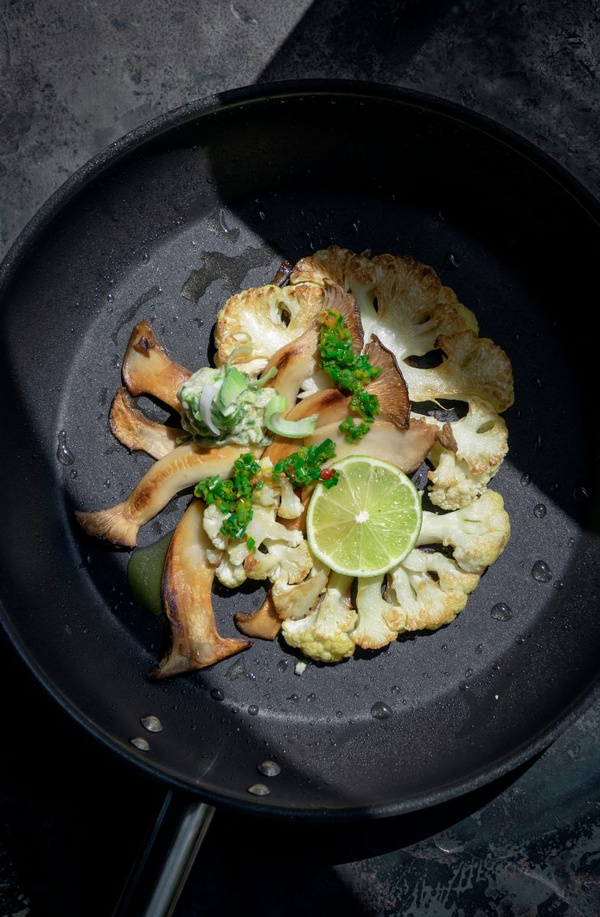 2. Blumenkohl-Medaillons: Kräuterseitlinge trocken mit einem Tuch putzen und in fingerdicke Scheiben schneiden. Blumenkohl putzen, waschen und in der Mitte durchschneiden. Den Strunk etwas herausschneiden. Rechts und links der Mittellinie jeweils zwei 1 cm dicke Scheiben abschneiden (= 4 Scheiben). Lauch putzen, gründlich waschen und in feine Ringe schneiden. In Rapsöl andünsten, Mandelmilch dazugeben und das Gemüse unter ständigem Rühren köcheln, bis es eine sämige Konsistenz hat. Salzen und pfeffern. Blumenkohlscheiben in Walnussöl braten, bis er Farbe annimmt und gar, aber noch knackig ist. Leicht salzen. Kräuterseitlinge in einer heißen Pfanne mit Rapsöl auf beiden Seiten gut anbraten und salzen. Die Kräuterseitling-Scheiben auf dem gebratenen Blumenkohl und dem Lauchgemüse anrichten, mit Marinade beträufeln und mit Schnittlauchröllchen garnieren