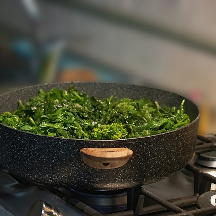 3. Rapsöl in einer tiefen Pfanne erhitzen, Brokkolistiele und ganze Knoblauchzehen unter Wenden kurz andünsten. Mit Brühe auffüllen. Nach 3 Minuten die Röschen hinzufügen und weitere 4-6 Minuten garen.