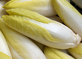 3. Sobald der Chicorée gar ist, auf einem Sieb kurz abtropfen lassen und auf einer Platte anrichten.