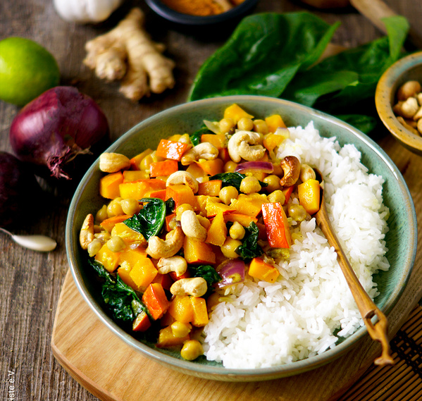 5. Das Curry mit Reis servieren, die Cashewkerne als Topping darüber geben.