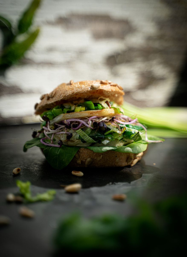 5. Die Vollkornsemmeln waagerecht durchschneiden, untere Hälfte mit der Soße bestreichen, Spinatblätter und die Kohlrabi-Pattis daraufgeben. Mit der zweiten Semmelhälfte abschließen und genießen.