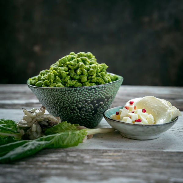1. Mangoldblätter von den Stielen schneiden. Mangoldgrün, waschen und portionsweise in kochendem Salzwasser ca. 2-3 Minuten blanchieren, bis die Blätter zusammenfallen. Mit einem Schaumlöffel aus dem kochenden Wasser nehmen und sofort in Eiswasser abschrecken; abtropfen lassen und erst jetzt etwas kleiner schneiden und anschließend pürieren.