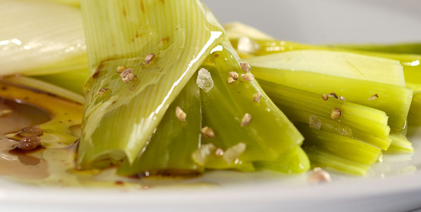 3. Den Aceto Balsamico und das Olivenöl mischen und den Porree darin über Nacht einlegen. Kurz vor dem Servieren mit grobem Salz und Pfeffer bestreuen.