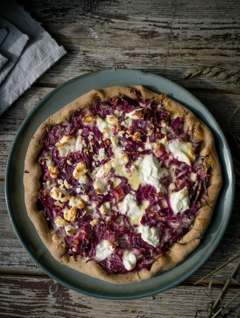 7. Boden und Rand der Quicheform mit Teig auskleiden. Die Rotkohlmasse einfüllen und mit dem Guss auffüllen. Fetakäse darüber bröseln und im Backofen auf mittlerer Einschubhöhe ca. 45 Minuten backen. Aus dem Ofen nehmen und ca. 5 Minuten ruhen lassen, erst dann anschneiden.