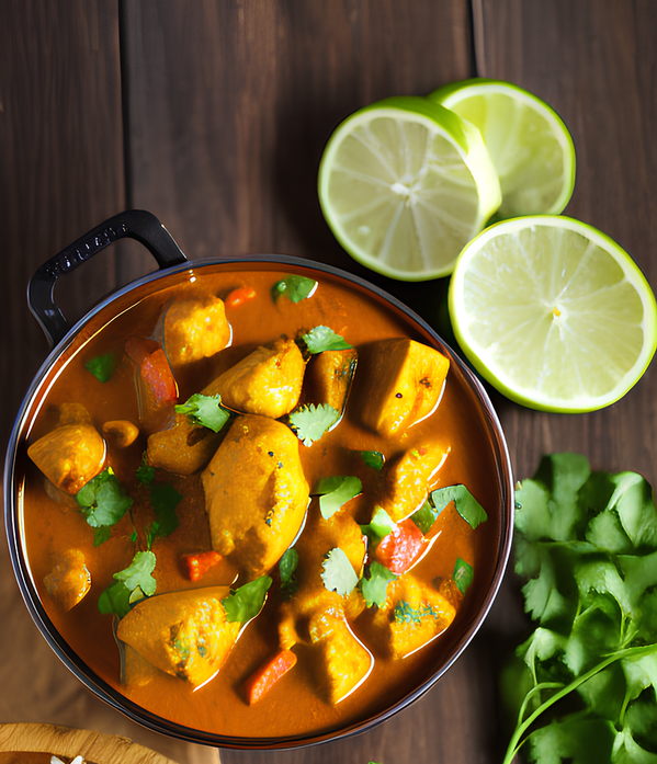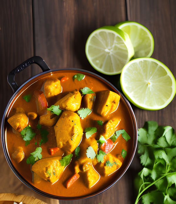 6. Curry erneute mit Salz und Limettensaft abschmecken. Lauchzwiebeln und Koriander unterrühren. Brotchips unter den Salat heben. Curry und Salat anrichten und mit Koriander garnieren.