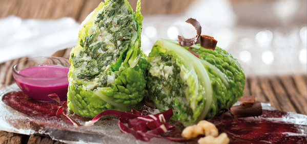 4. Vier Wirsingblätter blanchieren, abschrecken und anschließend würzen. Den Strunk entfernen, mit der Pastinaken-Spinat-Mischung füllen, einrollen und mit Butter bepinseln. Im Ofen bei 150° Grad mindestens 20 Minuten backen und anschließend servieren.