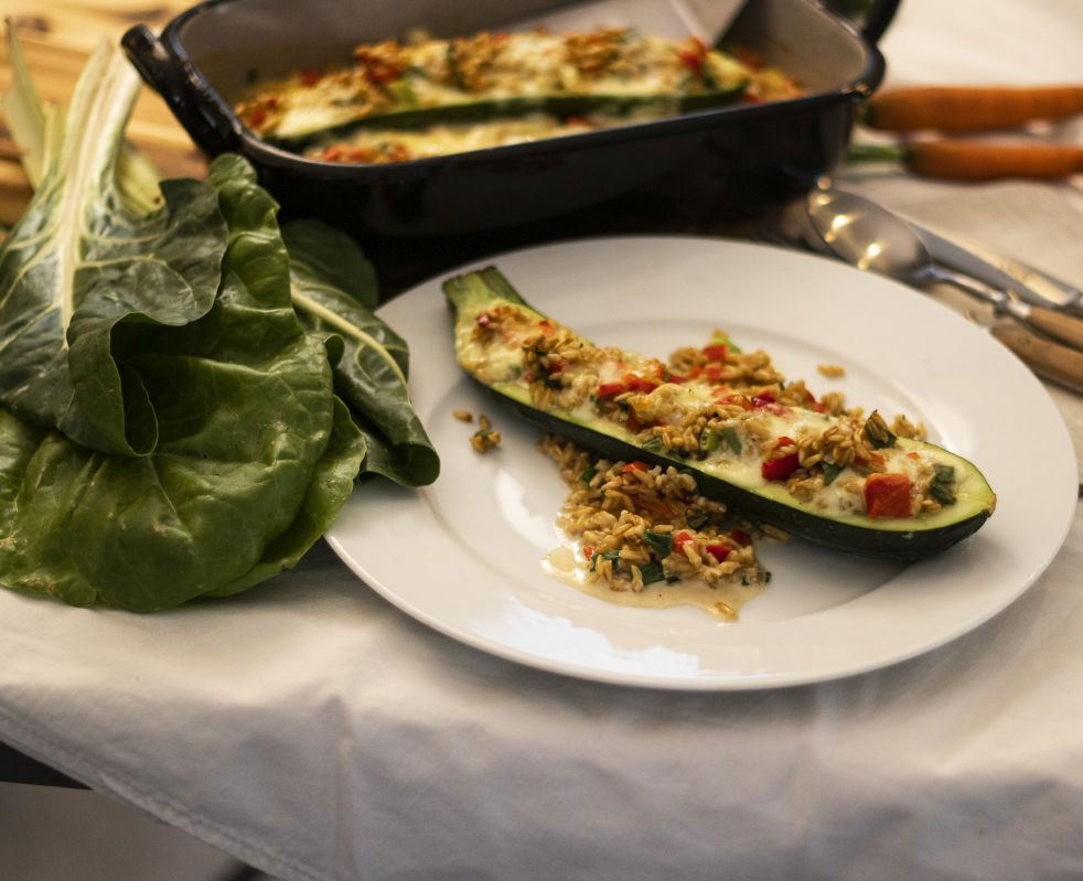 4. Die ausgehöhlten Zucchinihälften großzügig mit der Füllung füllen.
