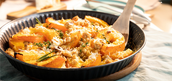 2. Teig kurz kalt stellen. Währenddessen Kürbis entkernen, in Spalten schneiden und in einer Auflaufform auslegen. Mit Öl beträufeln. Die Brösel über dem Kürbis verteilen und alles 30 Minuten backen.