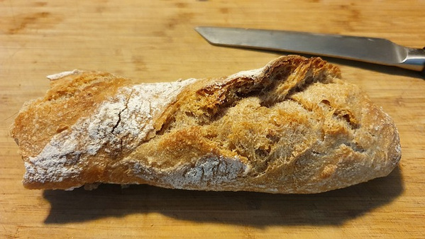 2. Laib auf ein mit Backpapier belegtes Blech setzen. Mit einem scharfen Messer der Länge nach 1/2 cm tief einschneiden und leicht mit Mehl bestäuben. Im vorgeheizten Backofen bei 200 Grad (Gas 3 Umluft 180 Grad) auf der 2. Schiene von unten 35-40 Min. goldbraun backen. Brot herausnehmen und auf einem Rost auskühlen lassen. Brot in dünne Scheiben schneiden und servieren.