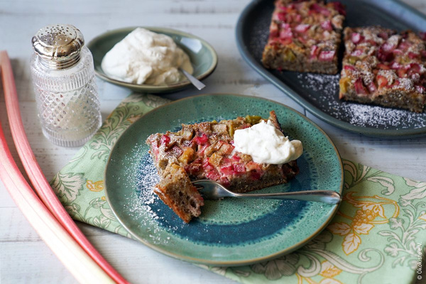 5. Die Masse in der Form verteilen und glatt streichen. Nun die Rhabarberstücke gleichmäßig darauf verteilen und etwas eindrücken.