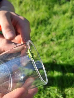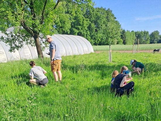 Anschließend haben die Kinder dabei geholfen, Kennarten im Grünland zu bestimmen. Im Rahmen einer Fördermaßnahme, müssen mindestens 4 Kennarten in 2 Bereichen auf der Wiese nachgewiesen werden. Zusätzlich suchte die Truppe interessiert mit Becherlupen nach Kleintieren auf der Wiese und freute sich über ihre Funde.