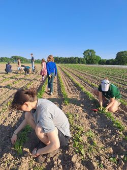 Zum Schluss ging es dann noch zu den Buschbohnen, hier musste händisch in der Reihe gehackt werden. Mechanische Unkrautregulierung statt Einsatz von Herbiziden ist ein wichtiger Bestandteil des Öko-Landbaus.