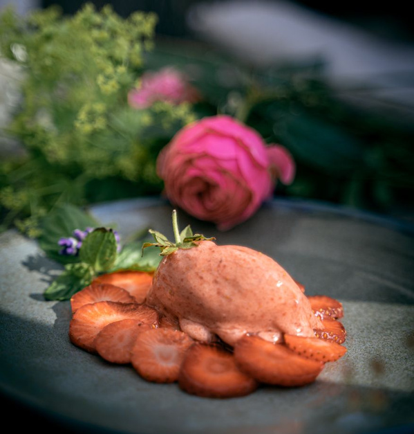5. Gefrorene Erdbeeren pürieren, Zucker und Kokosmilch dazugeben und zügig zu einer cremigen Masse verrühren (dies geht am besten in einer Küchenmaschine). Sofort Kugeln abstechen und auf den Basilikum-Erdbeeren verteilen.
