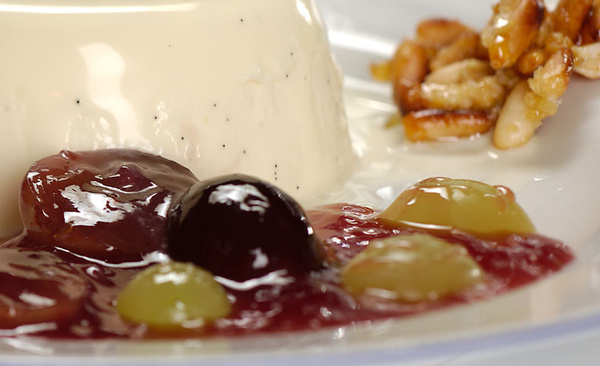 Panna Cotta mit Traubenkompott und Pinienkrokant