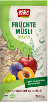GERSTENVOLLKORNFLOCKEN*, Cornflakes* (Mais*, Trennmittel: Sonnenblumenlecithin*), Aprikosen* getrocknet 2,7%, Pflaumen* getrocknet 2,5%, Äpfel* getrocknet 0,9%, Himbeeren* gefriergetrocknet,