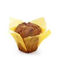 Muffin in gelbem Papier, saftiger Teig mit ordentlich Stückchen von saisonal wechselnder Frucht, schmeckt fruchtig-süß