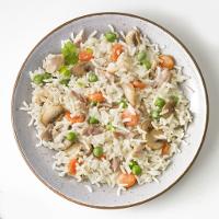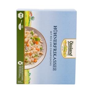 41% Reis* gegart (Wasser, Reis*, Speisesalz), 15 % Gemüse* - in veränderlichen Gewichtsanteilen (Karotten*, Erbsen*), 15% Hühnerfleisch* gegart,