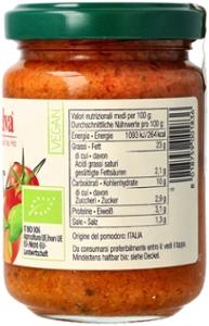 Das Tomaten Pesto ist ein aromatisch nussiges Pesto aus getrockneten Tomaten und Cashewnüssen, das unter Zugabe von mildem Sonnenblumenöl und Olivenöl extravergine zu einem cremigen Pesto