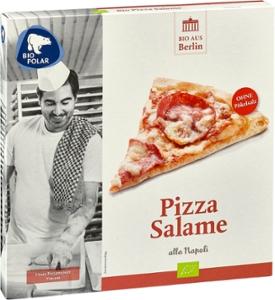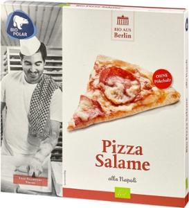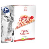 Teig* (WEIZENMEHL*, Wasser, Hefevorteig* [WEIZENMEHL*, Wasser, Hefe*], Meersalz, natives Olivenöl extra*, Hefe*), passierte Tomaten* 21 %, MOZZARELLA* 11,5 %, Salami* 7 % (Schweinefleisch*, Schweinespeck*, Salz, Pfeffer*, Knoblauch*, Koriander*, Muskat*, Bockshornklee*, Pastinake*, Liebstock*, Pfefferextrakt*, färbendes Lebensmittel: Rote Beete Pulver*, Antioxidationsmittel [Rosmarinextrakt*], Dextrose*, Reifekulturen, Buchenholzrauch), Wasser, Meersalz, natives Olivenöl extra*