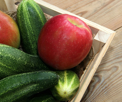 1. Gurke waschen und in dünne Scheiben hobeln. Apfel vierteln, entkernen und in feine Spalten schneiden.