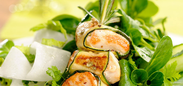 4. Jeweils ein Fleischstückchen in eine Zucchinischeibe einwickeln und aufspießen.