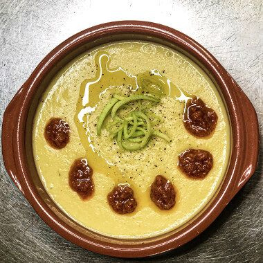 7. Die samtige Creme auf Tellern/Schalen verteilen, nach Belieben mit dem Lauch, Pesto Rosso und einem Spritzer Olivenöl garnieren.