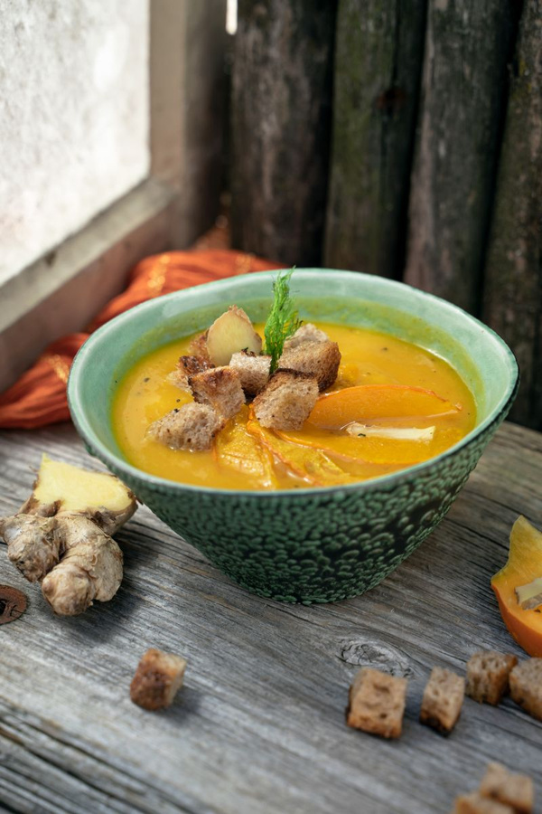 Kürbissuppe mit Croûtons und gebratenem Kürbis