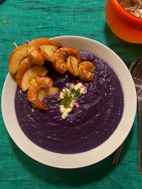 Rotkohlsuppe mit Garnelen-Apfelspießen