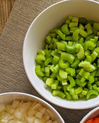 1. Den Staudensellerie abfädeln und in dünne Scheiben schneiden. Kleine Blättchen bei Seite legen.