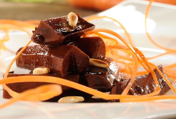 4. Möhren, mit dem Fond beträufelt und einigen gerösteten Pinienkernen servieren.